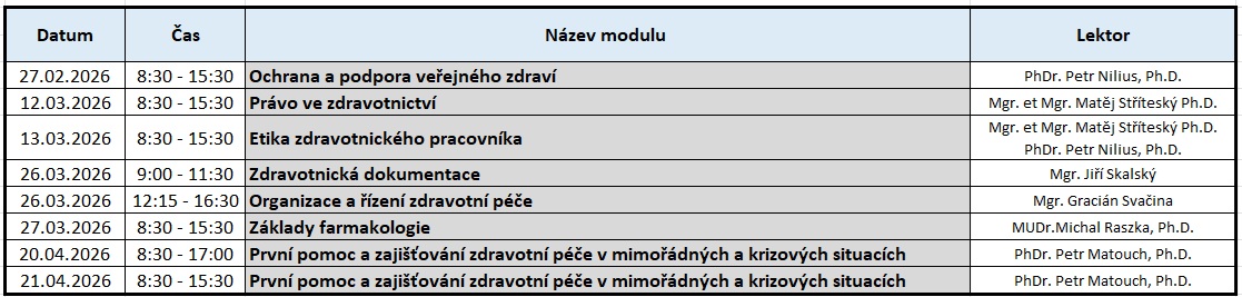 Účastníci kurzu budou seznámeni s následujícími tématy – První pomoc a zajišťování zdravotní péče v mimořádných a krizových situacích, Právo ve zdravotnictví, Organizace a řízení zdravotní péče, Zdravotnická dokumentace, Etika zdravotnického pracovníka, Ochrana a podpora veřejného zdraví a Základy farmakologie.